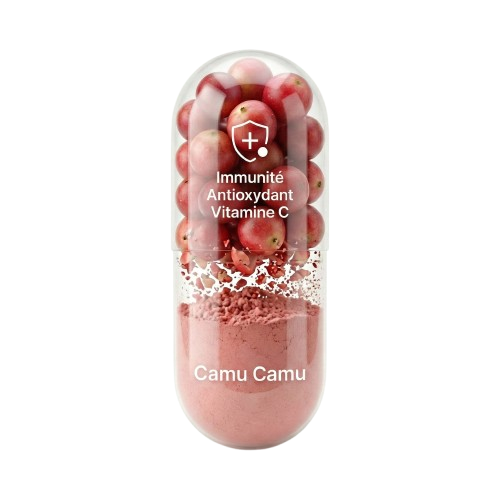CAMU ², c’est ce soutien. Un concentré de Camu Camu, fruit rare de l’Amazonie, exceptionnellement riche en vitamine C naturelle. Pas une promesse en l’air. Juste un fait : jusqu’à 40 fois plus de vitamine C qu’une orange.